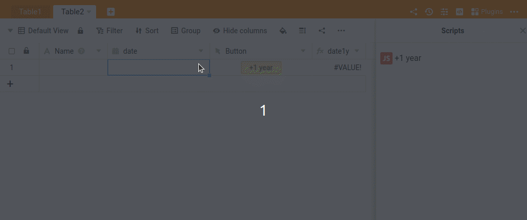 Every time you press the button, the date in the column date is increased by one year.
