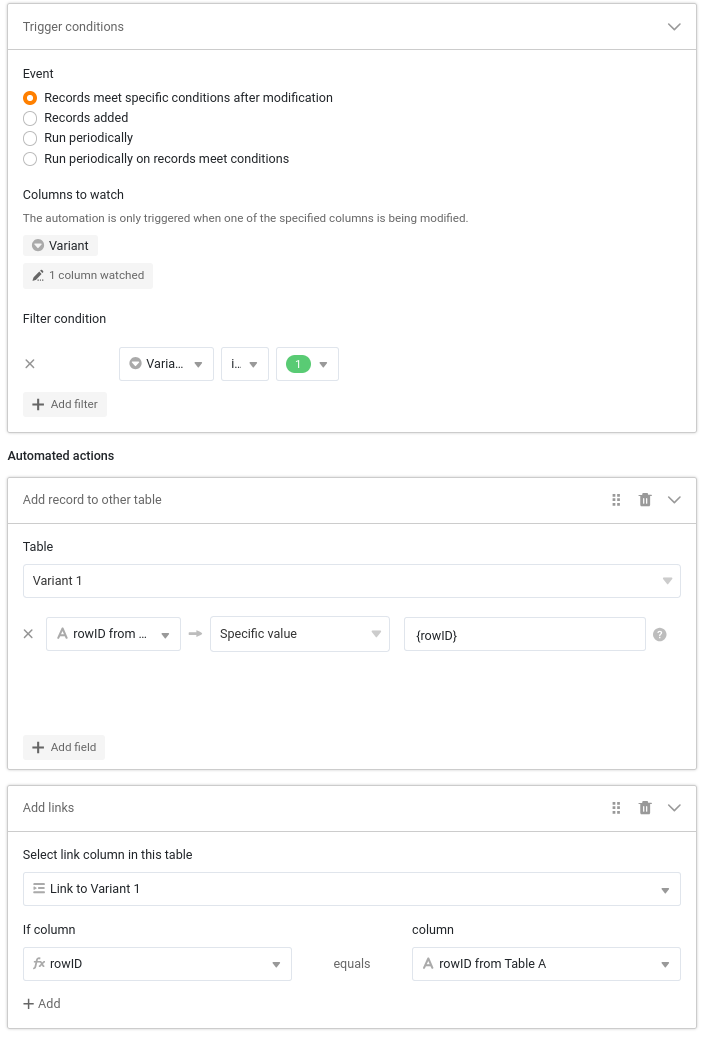 - if Variant 1 was selected in the single selection when creating the new entry in table A, a new entry should be created in the ‘Variant 1’ table. Same for Variant 2 etc.