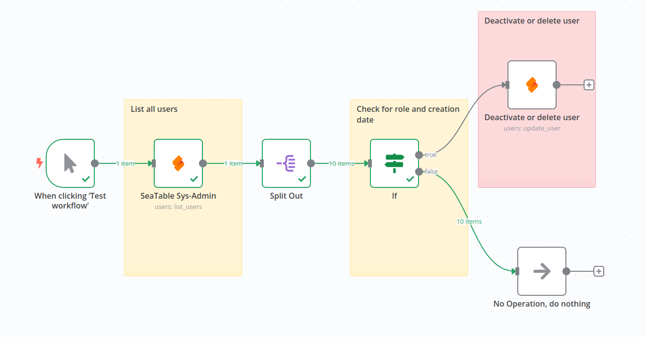 But until SeaTable offers that, you can build your own user management base. Create a base with username and their expiration dates. Then add an automation checking for users whose “time is up”. The automation runs a script that disables the user. Drawback of this solution: You must handle system admin credentials somehow.