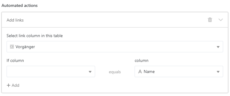 The rule sets a link between two records when a new record is created. The matching condition uses the “Name” column on one record, and matches it against a formula column on the other record.