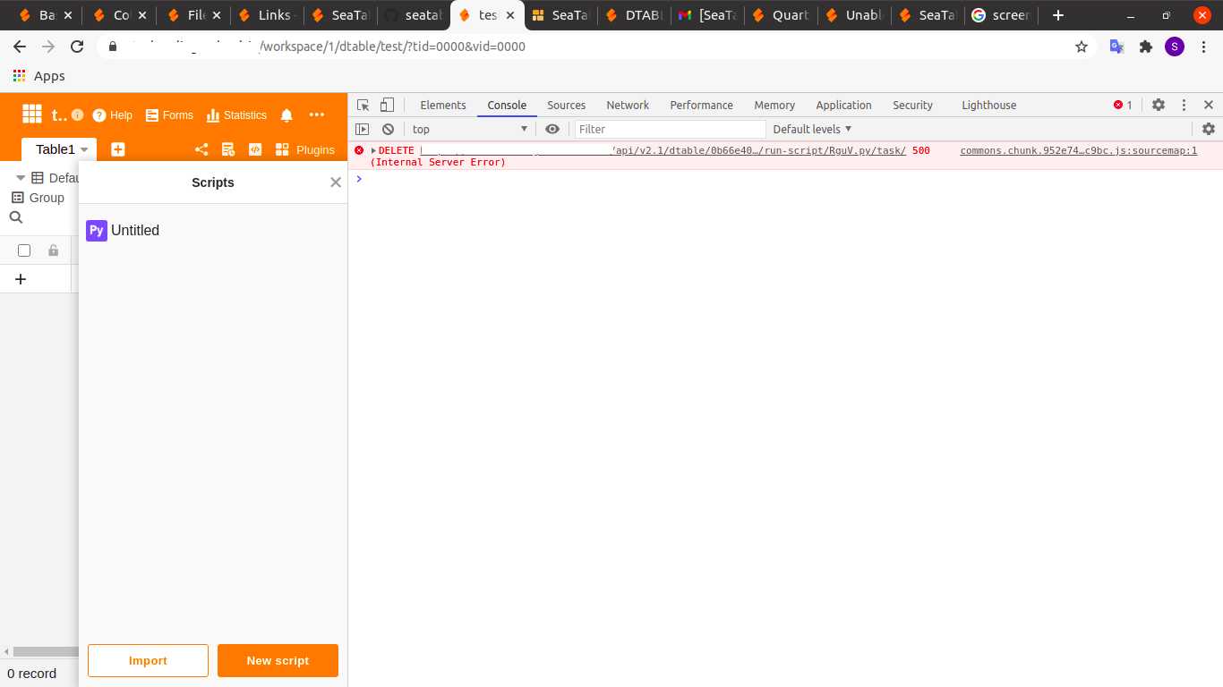 This is what I got: 2020-12-28 09:46:35,610 [ERROR] seahub.api2.endpoints.run_script:283 delete Invalid URL '/tasks/0b66e405-b652-486e-a073-d056874bcfad/RguV.py/': No schema supplied. Perhaps you meant http:///tasks/0b66e405-b652-486e-a073-d056874bcfad/RguV.py/?