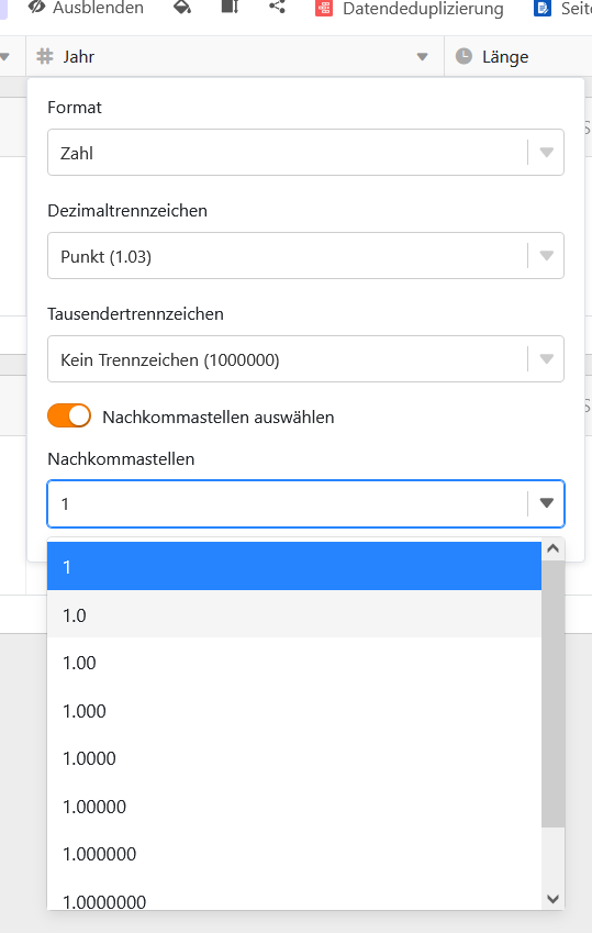 Using the German localization, it’s similarly confusing. After selecting the top most entry in the dropdown, the column format settings show: “Nachkommastellen: 1” (decimal digits: 1).
