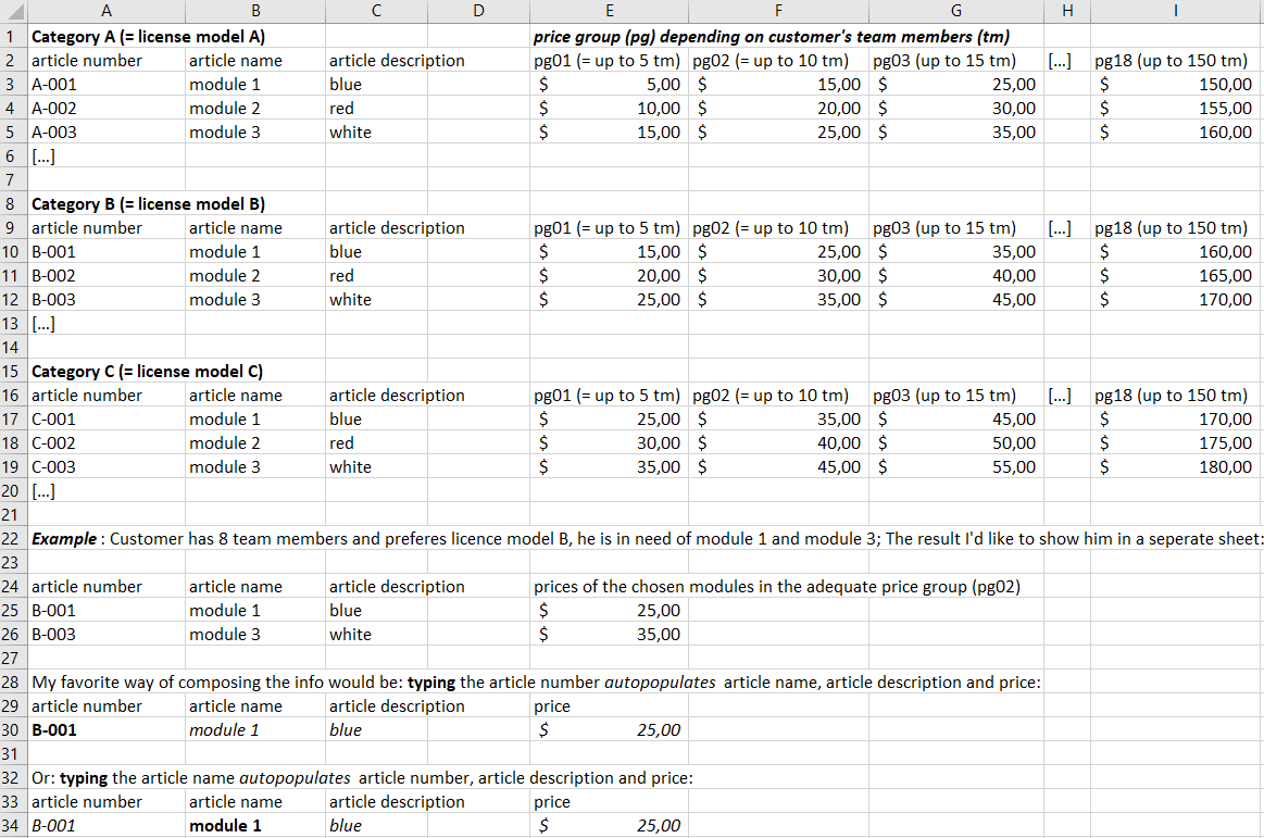 I have a price list with around 400 items. The articles are sorted into 3 categories: A, B, and C. Depending on the category, there are different article and material numbers for the same article.