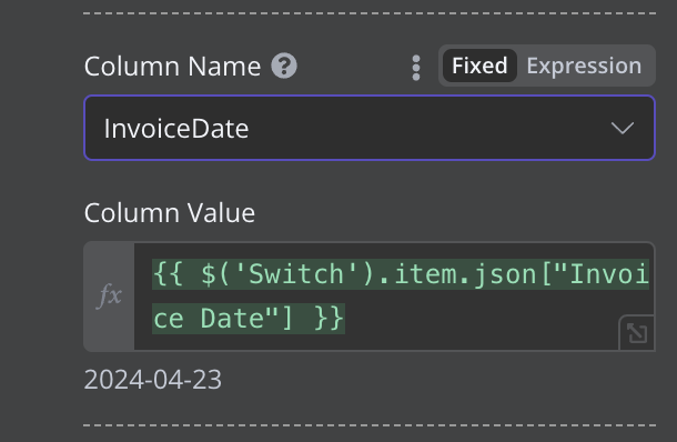 I realized that a simple {{ new Date($('Switch').item.json['Invoice Date']) }} works just as well. If Invoice Date is "", or event if it doesn’t exist at all in the JSON response, it still creates a new row with the InvoiceDate column empty without throwing an error. Not sure if this is the desired behaviour, but it does have the advantage of being simpler than my previous answer.