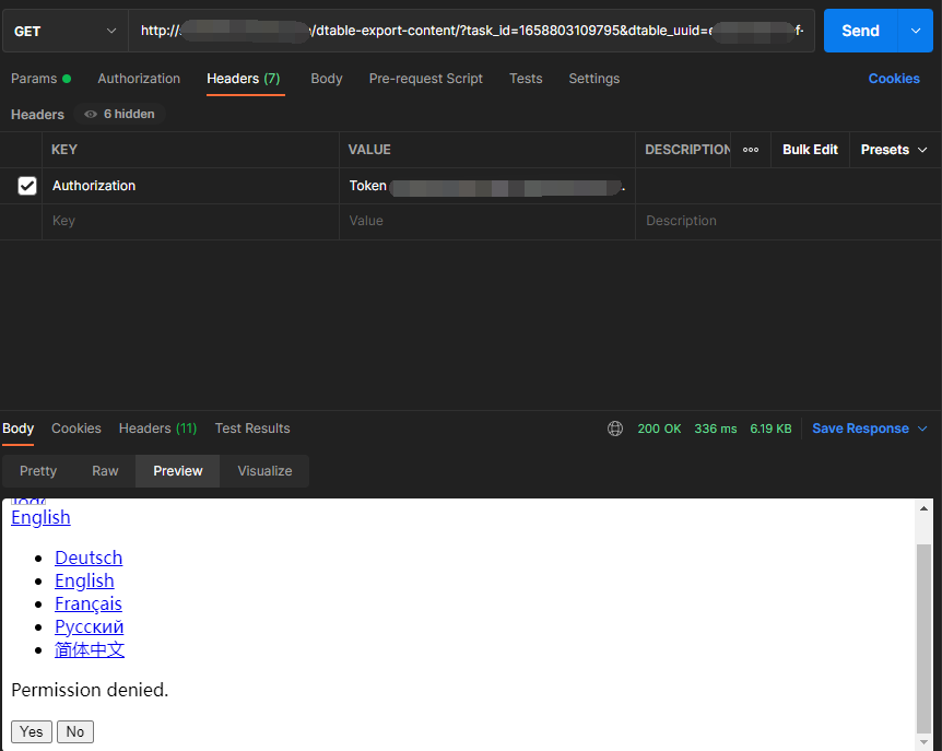 3.Download Exported File with Task ID - does not work and gives “Permission denied.” Despite the fact that I can download the file using a direct link in the browser (if authorized).