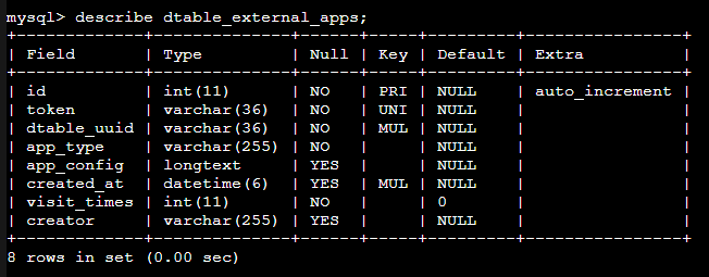 mysql> describe dtable_external_apps;