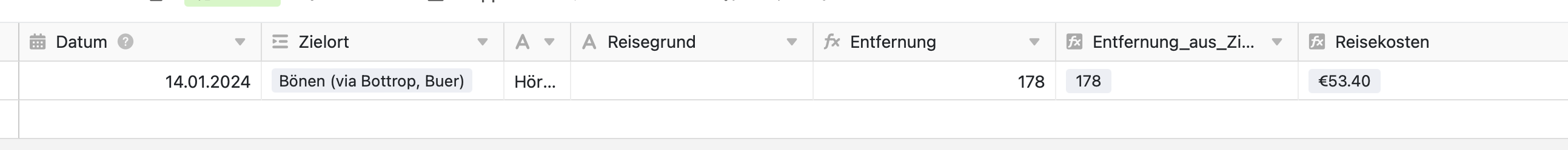 Die vorletzte Spalte ist die Berechnungsspalte, wenn diese exportiert wird, erkennt Excel das Zahlenformat. Auch “Reisekosten” wird aus der Ziel-Orte-Tabelle hinzugefügt.