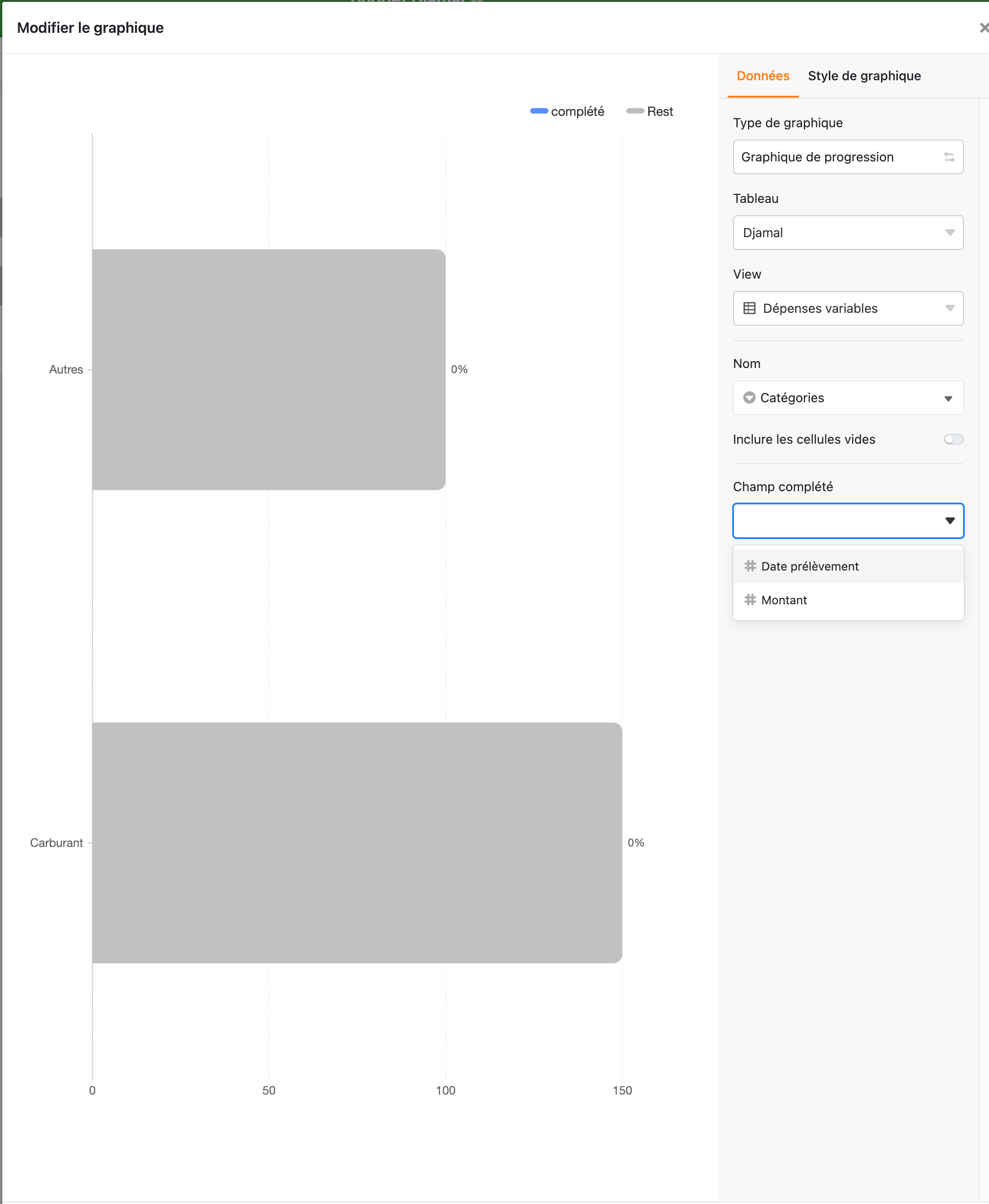 Since the last update, I’ve encountered an issue with creating charts using the statistics in my personal budget application. Previously, it was possible to enter formulas in the “Completed Fields,” and this functionality was working fine in the previous version of SeaTable. However, in the latest update, these formulas no longer appear, resulting in a non-functional progress chart.