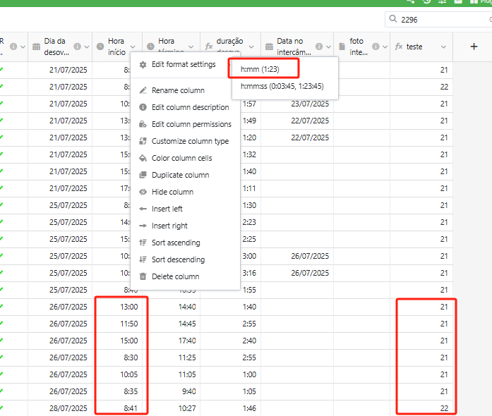 The duration column saves a period of time in seconds and displays this period either in format h:mm or h:mm:ss.