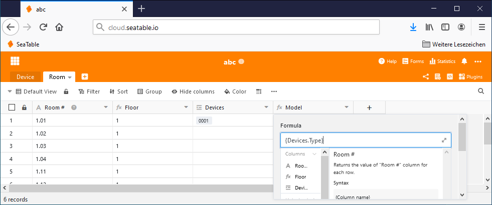 In the screenshot below, devices (monitors, projectors, …) are allocated to rooms. The column “Devices” shows the number(s) of the devices in that room. If I want to show the type of device behind that number, the formula is {Devices.Type}. “Type” is the name of the column in the associated table.