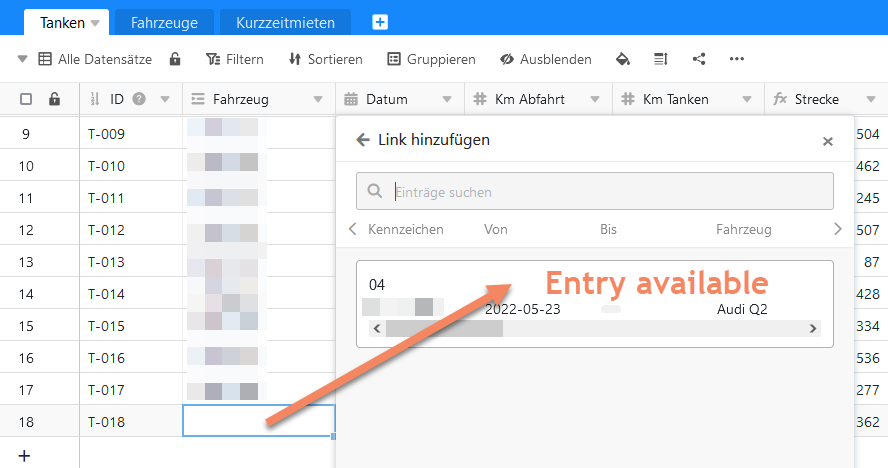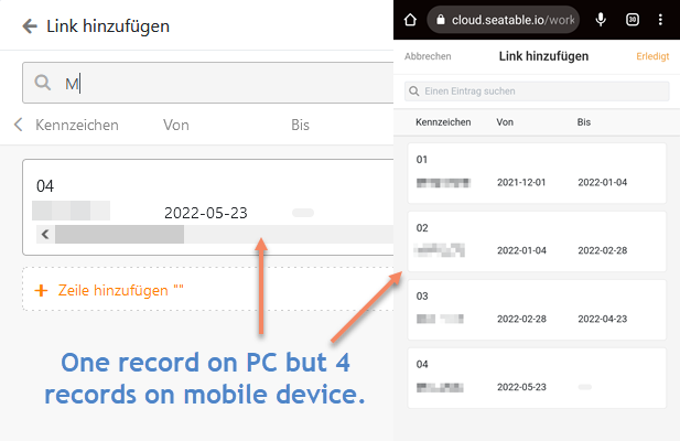 Additionally, when I use a browser on my PC/Laptop I see a list with records I can select for linking. In my case these are records from a special customized view. This means on my PC I see only one record. On my mobile device I first see an empty list and when I click on “add link” I see all records from the table. Not only the records from the filtered view.