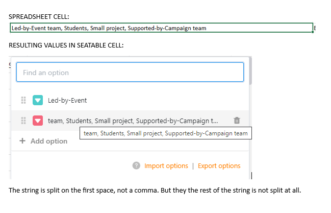 The excel file has a field with comma-separated labels that I want to bring in as a multiple select field in Seatable. Here’s an example of a cell with three labels: