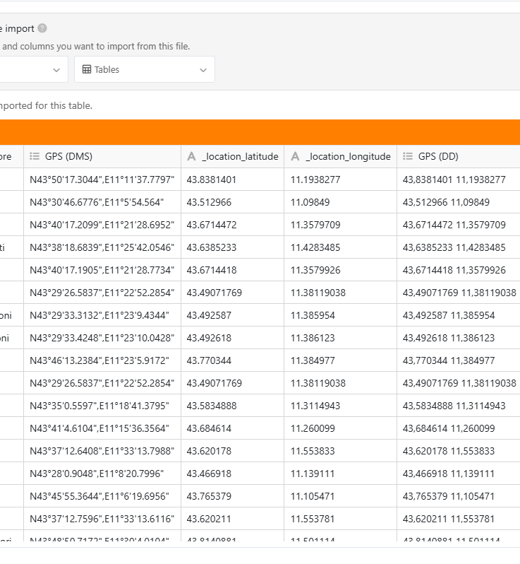 Sorry for this late reply, I hope it could help you anyway… Here is a little Python script that might do the job for the last step. Actually, the Geolocation column is expecting an object containing both lat and lng key with DD coordinates value. You will have to modify the TABLE_NAME, TXT_COORDS_COL and GEOLOCATION_COL at the beginning of the script to match your needs (probably only the table name as I used the columns’ names from your screenshot).