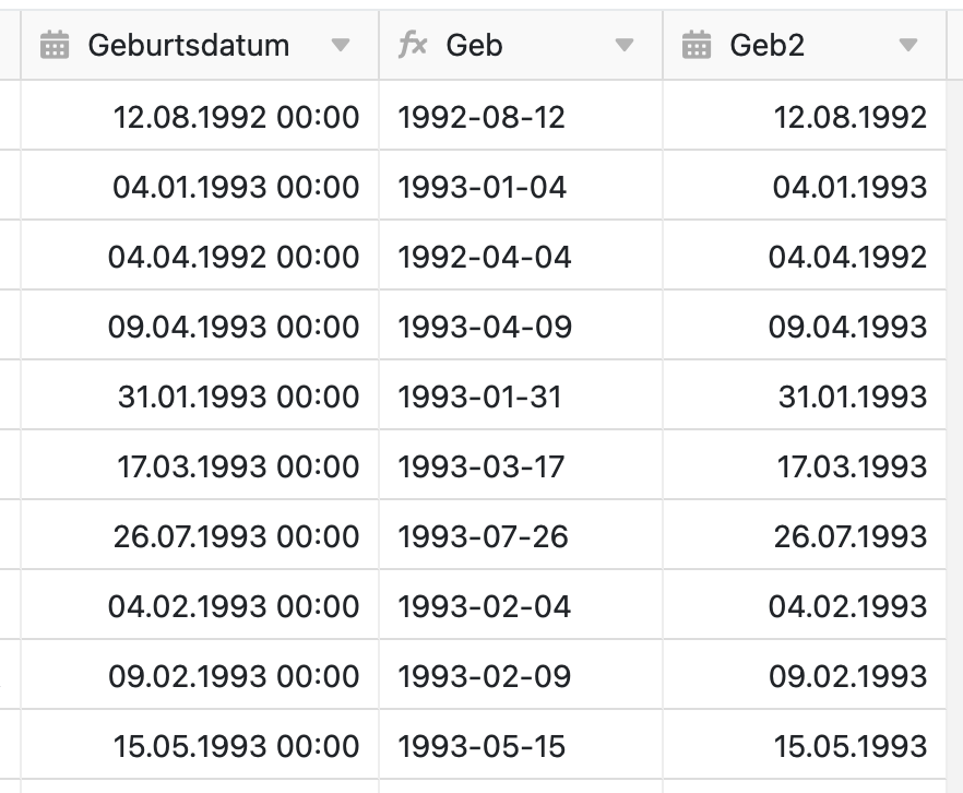 I added a formula column Geb with the formula date(year({Geburtsdatum}),month({Geburtsdatum}),day({Geburtsdatum})). This formula worked nicely on the original data to produce the result shown in the picture below.