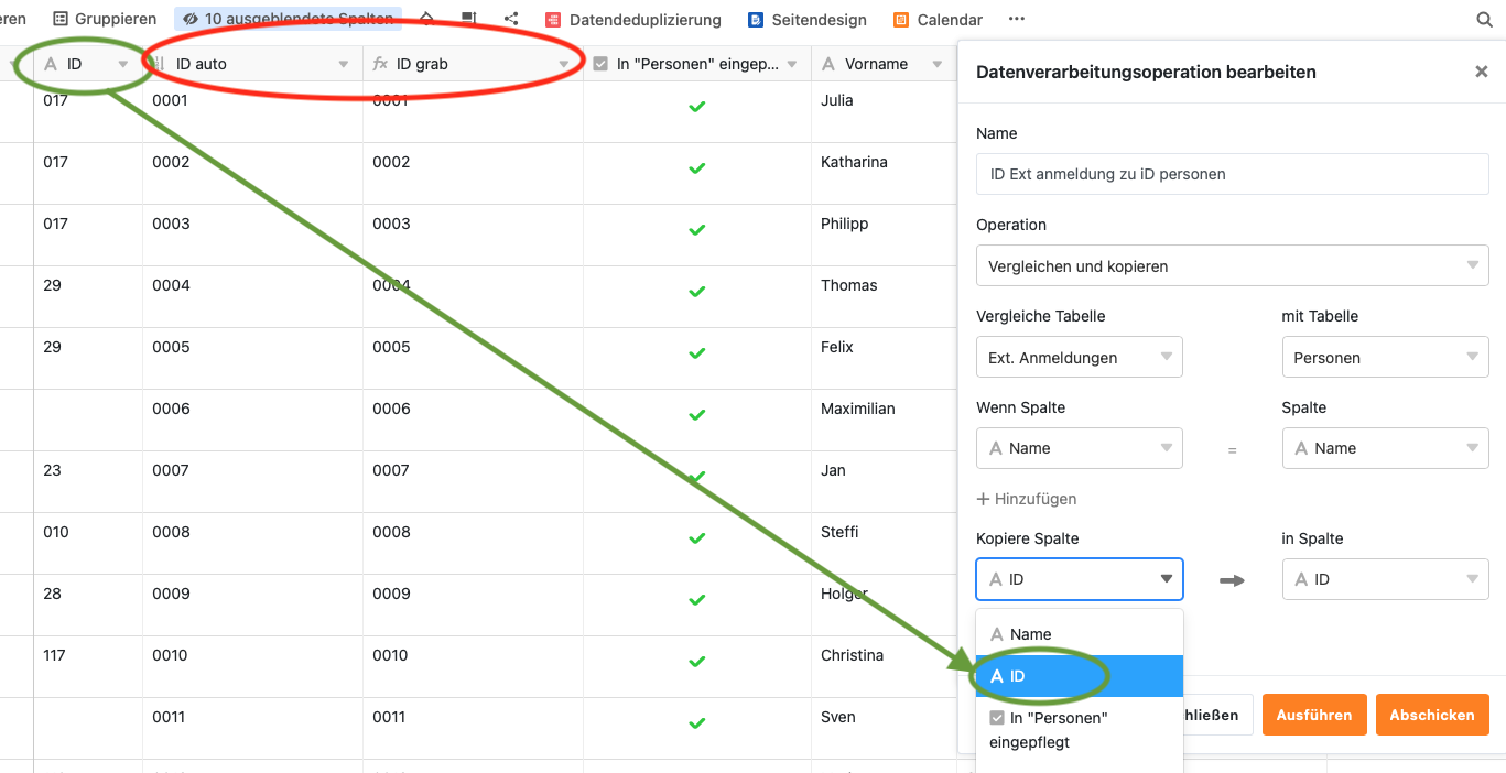 If Column “Name” in Ext. Anmeldung = Column “Name” in Table “Personen”, copy the IDs from/to the resepective ID columns.