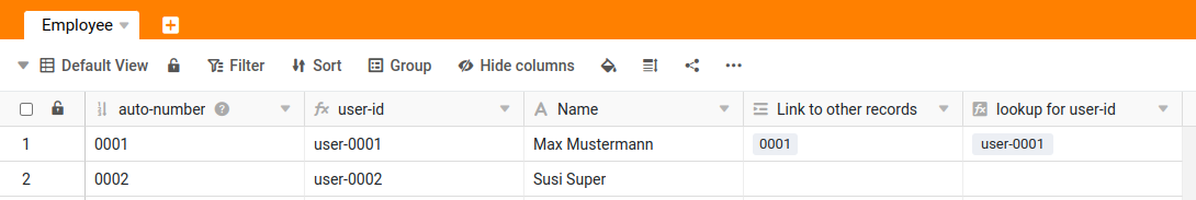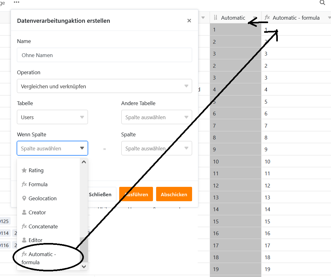 That is okay with lookups and links in the same table. What I am trying to do is via data processing or automation to automatically link auto numbers in one table (the user IDs) with the user id column in another table. In this case the auto number column does not show as a selectable option.
