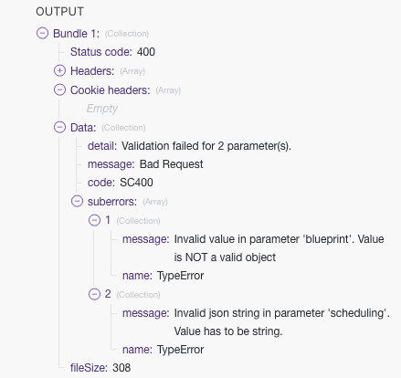 The problem is that I can’t get the right format for property “blueprint” and property “scheduling”. Here is my JSON code for the body :