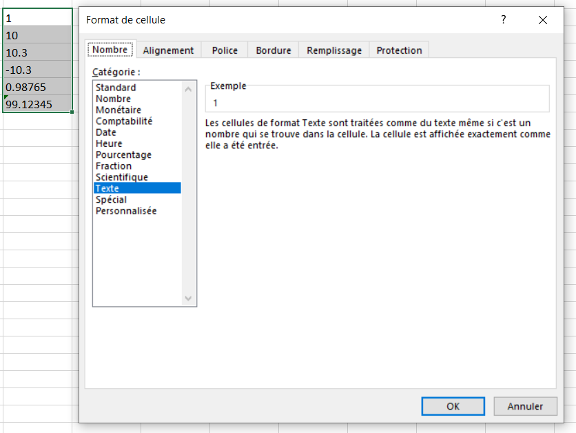 Whatever the separator chosen (comma or point), it doesn’t work when coming from a number formatted cell in excel.