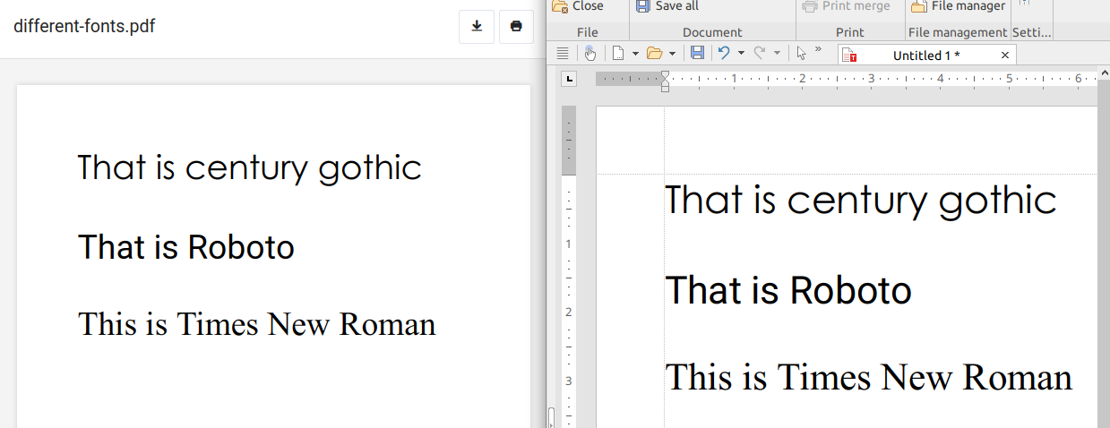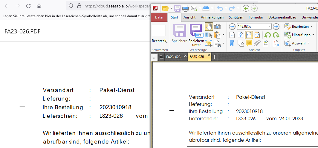 Here is a screenshot. The left side shows the document opend in the browser (within SeaTable) and the right side shows the same document downloaded from Seatable.