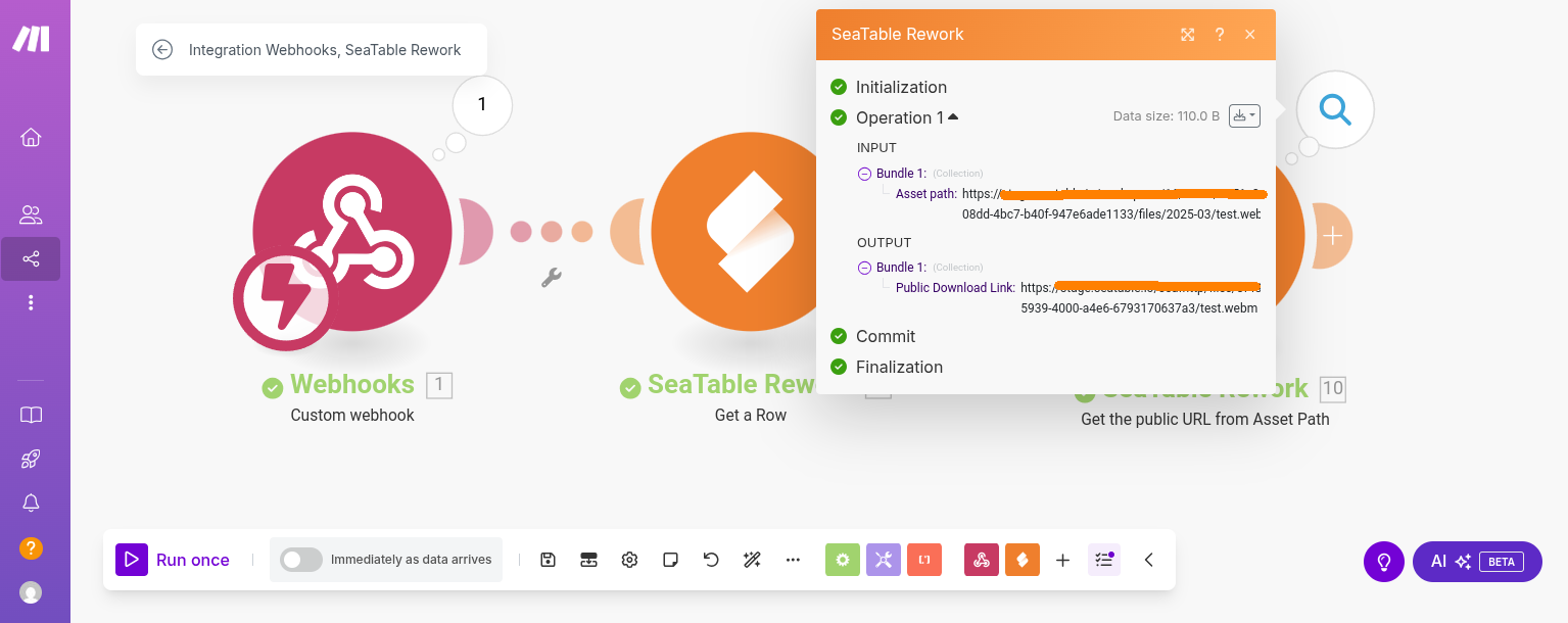 ich habe in make ein “Get a Row” Modul und danach den Seatable Bild Link im nächsten Modul “Get the public URL from asset path” remapped um es anschließend auf Instagram zu veröffentlichen.