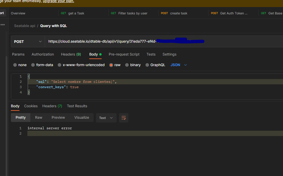 Hi, judging from your screenshot, you might have manually built this API request in your Postman. We recommend importing all the API calls into Postman by clicking on “Run in Postman” on api.seatable.io on the top right corner. This is to avoid any kind of mistake.