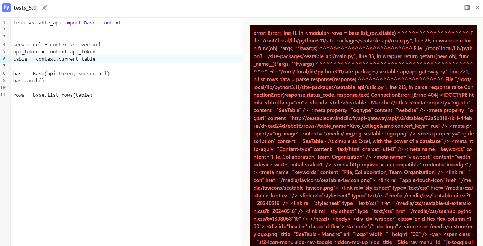 error: Error: line 11, in <module> rows = base.list_rows(table) ^^^^^^^^^^^^^^^^^^^^ File "/root/.local/lib/python3.11/site-packages/seatable_api/main.py", line 26, in wrapper return func(obj, *args, **kwargs) ^^^^^^^^^^^^^^^^^^^^^^^^^^ File "/root/.local/lib/python3.11/site-packages/seatable_api/main.py", line 33, in wrapper return getattr(new_obj, func.__name__)(*args, **kwargs) ^^^^^^^^^^^^^^^^^^^^^^^^^^^^^^^^^^^^^^^^^^^^^^^^ File "/root/.local/lib/python3.11/site-packages/seatable_api/api_gateway.py", line 221, in list_rows data = parse_response(response) ^^^^^^^^^^^^^^^^^^^^^^^^ File "/root/.local/lib/python3.11/site-packages/seatable_api/utils.py", line 213, in parse_response raise ConnectionError(response.status_code, response.text) ConnectionError: [Errno 404] <!DOCTYPE html> <html lang="en"> <head> <title>SeaTable - Manche</title> <meta property="og:title" content= "SeaTable" /> <meta property="og:type" content="website" /> <meta property="og:url" content="http://<url>/api-gateway/api/v2/dtables/<id>/rows/?table_name=Xivo_College&convert_keys=True" /> <meta property="og:image" content= "/media/img/og-seatable-logo.png" /> <meta property="og:description" content= "SeaTable - As simple as Excel, with the power of a database" /> <meta http-equiv="Content-type" content="text/html; charset=utf-8" /> <meta name="keywords" content="File, Collaboration, Team, Organization" /> <meta name="viewport" content="width=device-width, initial-scale=1" /> <meta http-equiv="x-ua-compatible" content="ie=edge" /> <meta name="keywords" content="File, Collaboration, Team, Organization" /> <link rel="icon" href="/media/favicons/seatable-favicon.png"> <link rel="apple-touch-icon" href="/media/favicons/seatable-favicon.png"> <link rel="stylesheet" type="text/css" href="/media/css/dtable-font.css" /> <link rel="stylesheet" type="text/css" href="/media/css/seatable-ui.css?t=20240516" /> <link rel="stylesheet" type="text/css" href="/media/css/seatable-ui-extension.css?t=20240516" /> <link rel="stylesheet" type="text/css" href="/media/css/seahub_python.css?t=1398068110" /> </head> <body> <div id="wrapper" class="en d-flex flex-column h100"> <div id="header" class="d-flex"> <a href="/" id="logo"> <img src="/media/custom/mylogo.png" title="SeaTable" alt="logo" width="" height="32" /> </a> <span class="sf2-icon-menu side-nav-toggle hidden-md-up hide" title="Side nav menu" id="js-toggle-side-nav" aria-label="Side nav menu"></span> <div id="lang"> <a href="#" id="lang-context" data-lang="en">English <span class="dtable-font dtable-icon-drop-down"></span></a> <div id="lang-context-selector" class="sf-popover hide"> <ul class="sf-popover-con"> <li><a href="/i18n/?lang=de">Deutsch</a></li> <li><a href="/i18n/?lang=en">English</a></li> <li><a href="/i18n/?lang=es">Español</a></li> <li><a href="/i18n/?lang=fr">Français</a></li> <li><a href="/i18n/?lang=ru">Русский</a></li> <li><a href="/i18n/?lang=pt">Portuguese</a></li> <li><a href="/i18n/?lang=zh-cn">简体中文</a></li> </ul> </div> </div> </div> <div id="main" class="container-fluid w100 h100"> <div class="row"> <div id="main-panel" class="w100 ovhd"> <div class="text-panel"> <p>Sorry, but the requested page could not be found.</p> </div> </div> </div> </div> <div id="confirm-popup" class="hide"> <div id="confirm-con"></div> <button id="confirm-yes">Yes</button> <button class="simplemodal-close">No</button> </div> </div><!-- wrapper --> <script type="text/javascript"> var SEAFILE_GLOBAL = { csrfCookieName: 'dtable_csrftoken' }; var app = { ui : { currentDropdown: false, currentHighlightedItem: false, freezeItemHightlight: false } } </script> <script type="text/javascript" src="/media/assets/scripts/lib/jquery-3.7.0.min.js" id="jquery"></script> <script type="text/javascript"> function prepareAjaxErrorMsg(xhr) { var error_msg; if (xhr.responseText) { var parsed_resp = JSON.parse(xhr.responseText); // use `HTMLescape` for msgs which contain variable like 'path' error_msg = HTMLescape(parsed_resp.error || parsed_resp.error_msg || parsed_resp.detail); } else { error_msg = gettext("Failed. Please check the network."); } return error_msg; } function ajaxErrorHandler(xhr, textStatus, errorThrown) { var error_msg = prepareAjaxErrorMsg(xhr); feedback(error_msg, 'error'); } (function() { var lang_context = $('#lang-context'), lang_selector = $('#lang-context-selector'); lang_context.parent().css({'position':'relative'}); if ($('#header').is(':visible')) { // for login page lang_selector.css({ 'top': lang_context.position().top + lang_context.height() + 5, 'right': 0 }); } var setLangSelectorMaxHeight = function() { if ($('#header').is(':visible')) { // for login page $('.sf-popover-con', lang_selector).css({ 'max-height': $(window).height() - lang_selector.offset().top - 12 }); } }; $(window).on('resize', function() { if (lang_selector.is(':visible')) { setLangSelectorMaxHeight(); } }); lang_context.on('click', function() { lang_selector.toggleClass('hide'); if (lang_selector.is(':visible')) { setLangSelectorMaxHeight(); } return false; }); $(document).on('click', function(e) { var element = e.target || e.srcElement; if (element.id != 'lang-context-selector' && element.id != 'lang-context') { lang_selector.addClass('hide'); } }); })(); if ($('.side-nav').length) { $('#logo').addClass('hidden-sm-down'); $('#js-toggle-side-nav').removeClass('hide'); } $('#js-toggle-side-nav').on('click', function() { $('.side-nav').addClass('side-nav-shown'); $('').modal({ overlayClose: true, onClose: function() { $('.side-nav').removeClass('side-nav-shown'); $.modal.close(); }}); $('#simplemodal-container').css({'display':'none'}); return false; }); $('.js-close-side-nav').on('click', function() { $('.side-nav').removeClass('side-nav-shown'); return false; }); </script> </body> </html>