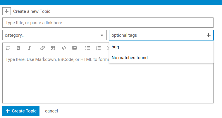 What I am missing (do not know if this exist before) is the category or subcategory “BUGS”. And when I want to add a new topic I cannot create an “optional tag”. No button and pressing return does not work as well.