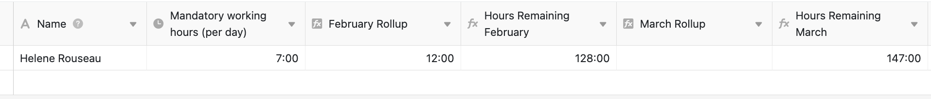I then created an “Hours Remaining for February” column with a formula: **(20 * {Mandatory working hours (per day)}) - {February Rollup}** and then do it for every month Feb, Mar, April and so on.
