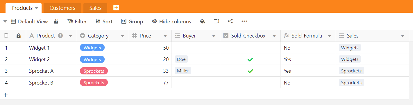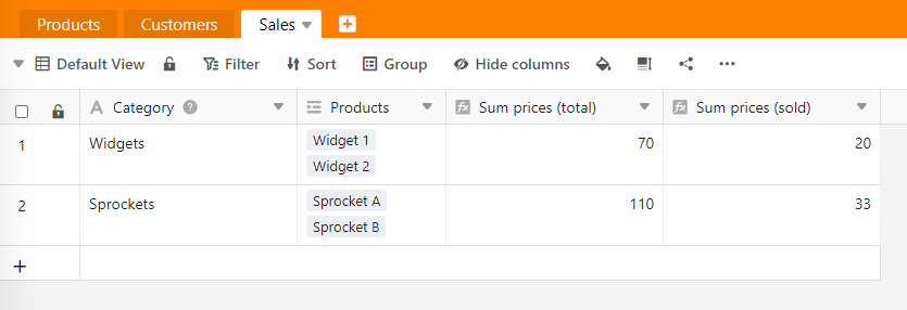 I’d like to calculate the total using the column Sold-Formula from the Products table. I’ve tried adding a new column using the following formulas, but they both return “Formula is invalid”: