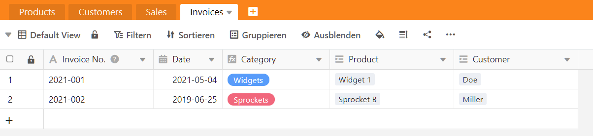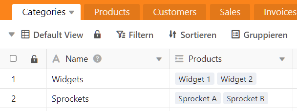 What I imagined is: When adding a new invoice, I would first select a product category in the Column “Category” (for example Widgets). In the next column, I need to enter the product that was sold.