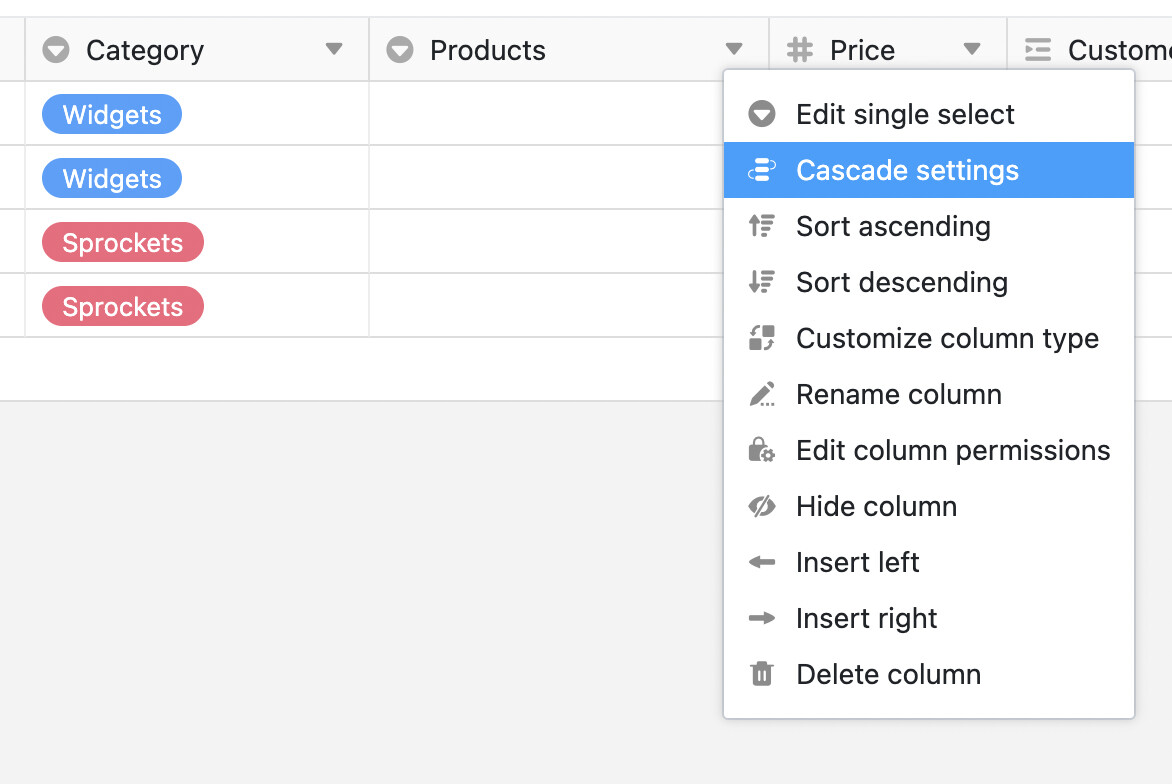 How to do it? Just create your “Category” single select options, and then create another single select column “Product”. Then, in the menu of “Product”, select “Cascade settings”.