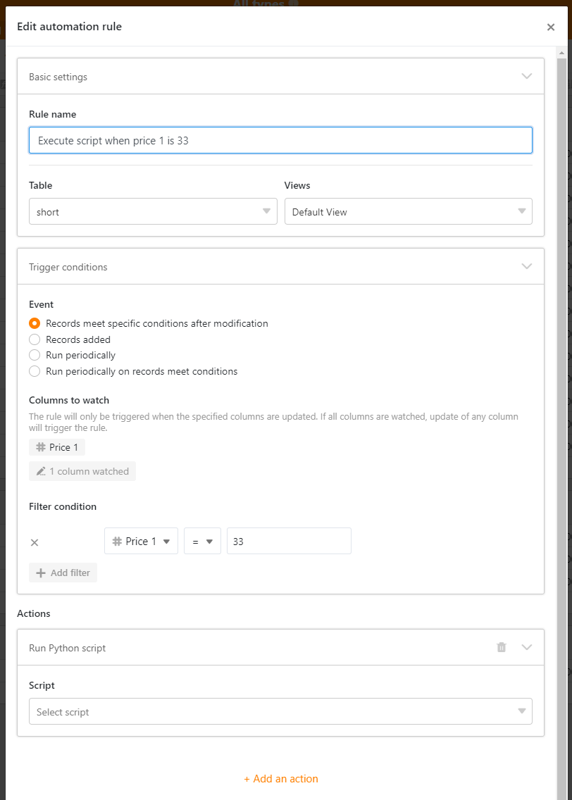 The most comfortable (but not free) way is to use the automation rules, where a Python script will be executed when a filter condition is met. As it’s fully automatic, the processing will be carried out as soon as a row fulfills the filter. This feature is but a paid feature in the Enterprise plan.