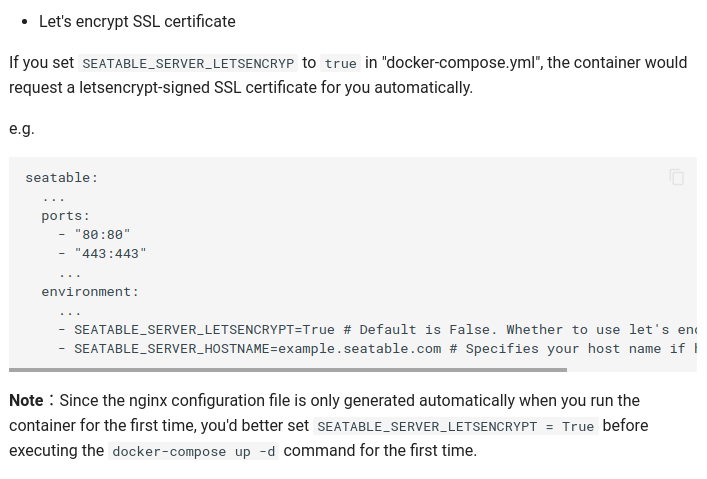 - SEATABLE_SERVER_LETSENCRYPT=True # Default is False. Whether to use let's encrypt certificate.