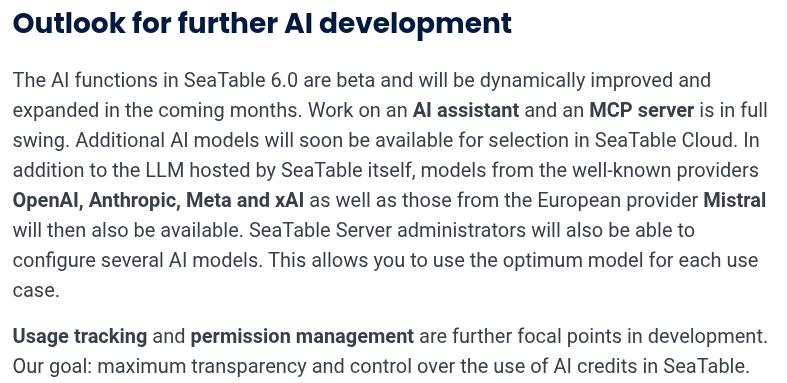 As of now, SeaTable 6.0 is available as a beta for all self-hosters, including updated admin and API documentation (with installation instructions for your own AI server).