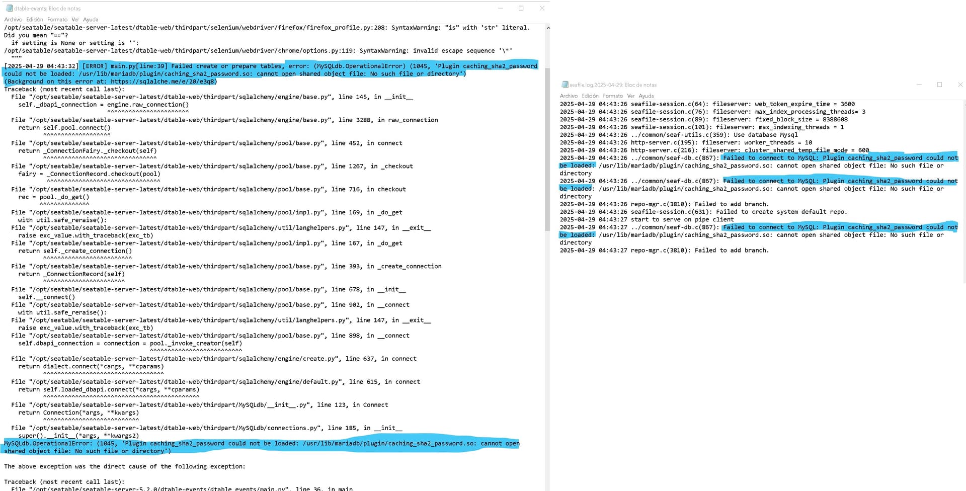 mysql_native_passwordplugin loaded or available. Attempts to switch the user fail (see error below). - SeaTable’s internal components (including Seafile, dtable-web, dtable-events) appear unable to handle
