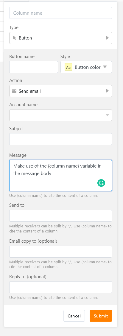 Here’s a workaround: Rather than using a static message template in the button column, you can compose your message by citing multiple text columns using the {column name} variable. Each text column is kind of a text block. This means, when you want to edit a message, you modify the corresponding text column. The message is then sent directly from SeaTable.
