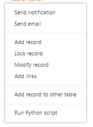 So here just some general comments: SeaTable Enterprise comes with automations. An automation executes one or multiple actions based on a set of conditions (aka rules). This are the available actions: