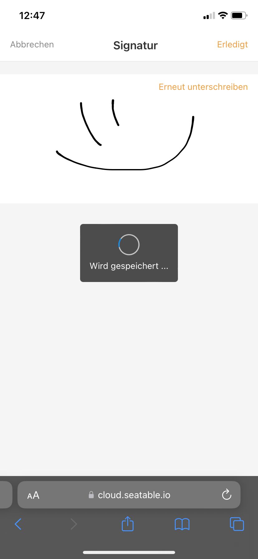 I have a table with a signature column with a form for it. Now when I want to fill out this form on my phone and I give my signature, it just says, “Saving…” and nothing more happens. I can’t come back and submit the form. What can I do there? Is this a Seatable bug?