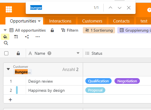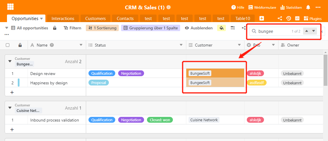 In this table, we group by “Customer” and when you search “Bungee”, the values in that column which include “Bungee” are highlighted.