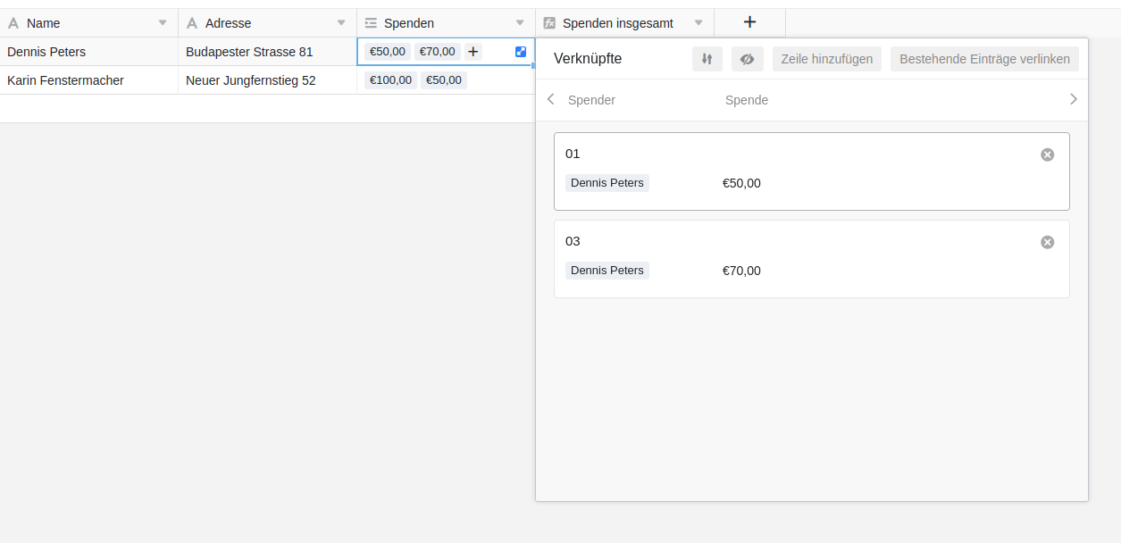 Wenn du in die Spalte “Verknüpfung zu anderen Einträgen” klickst, in der du schon eine Verlinkung zu einem Spender erstellt hast, findest du in dem sich öffnenden Fenster die Option “Zeile hinzufügen”. So kannst du weitere Spenden zu einem bestehenden Eintrag hinzufügen.