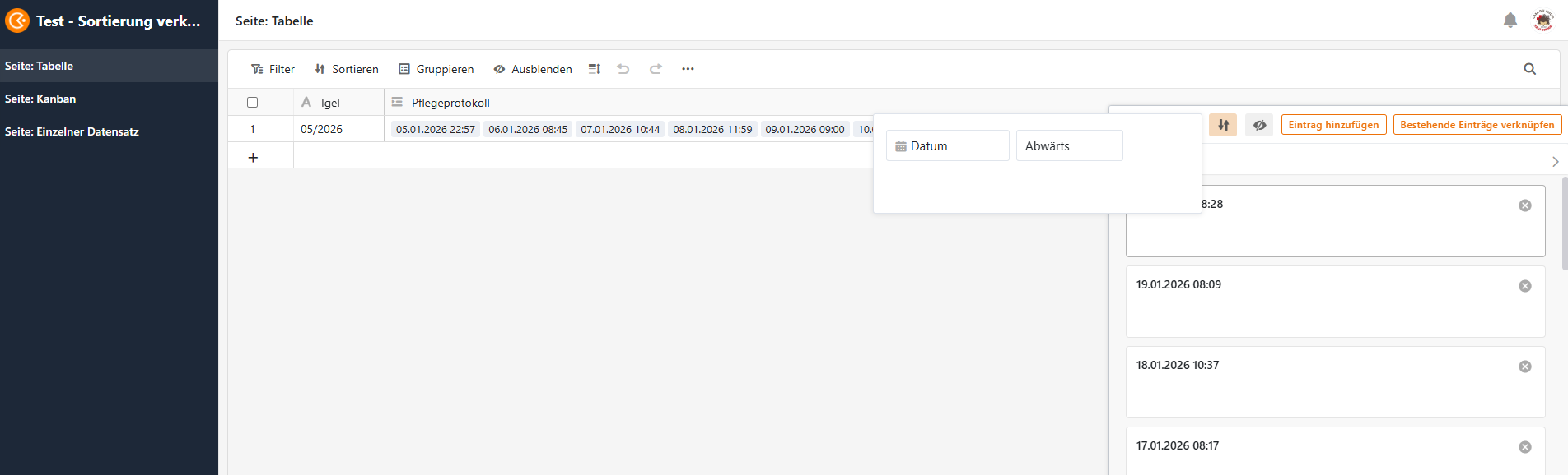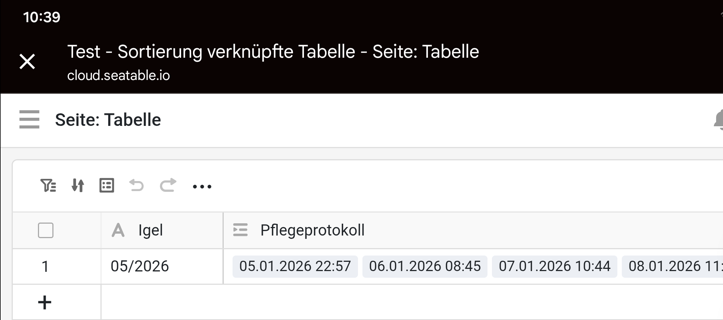 Wir möchten die Einträge absteigend nach Datum (erste Spalte verknüpfte Tabelle) sortiert haben.