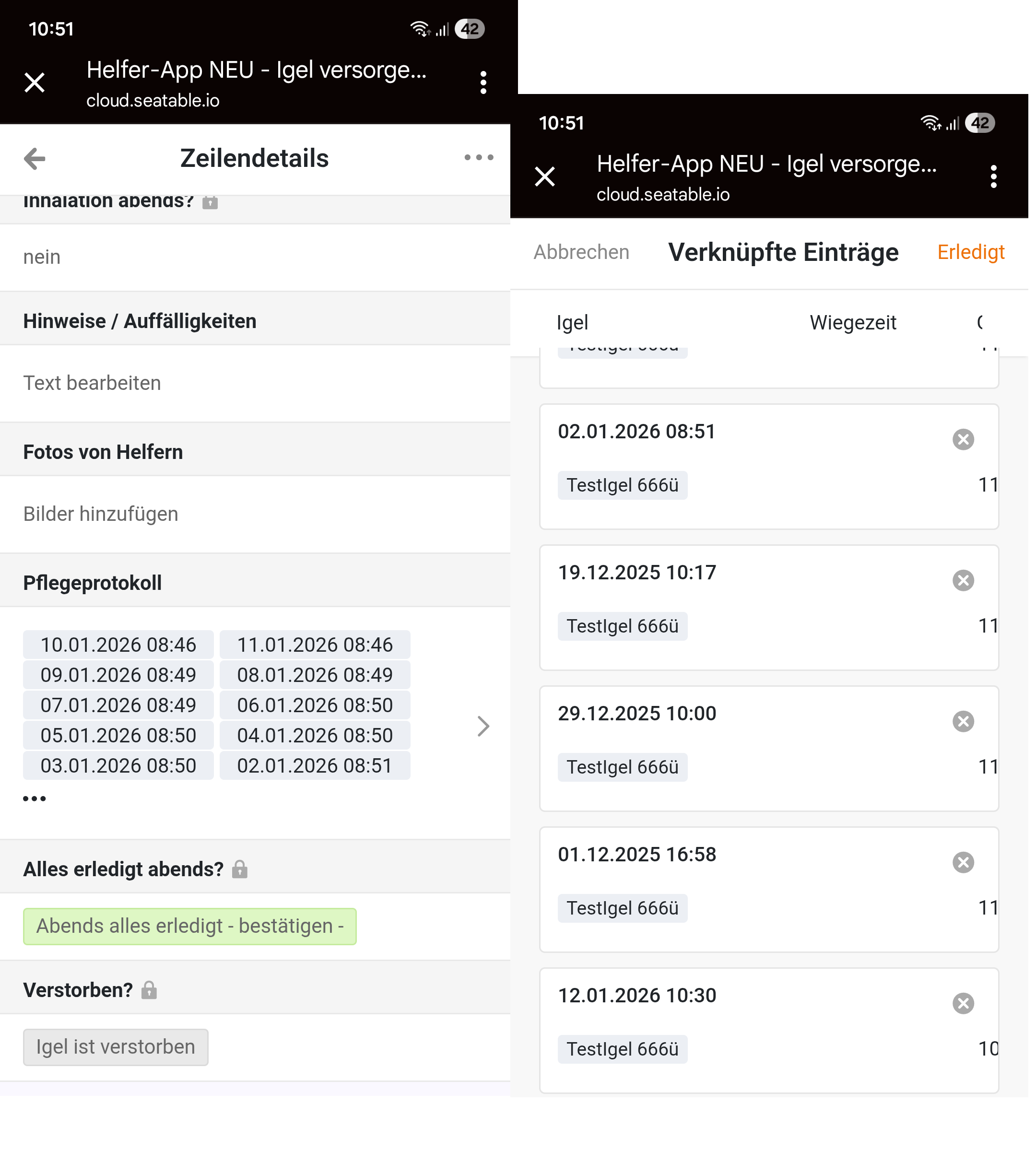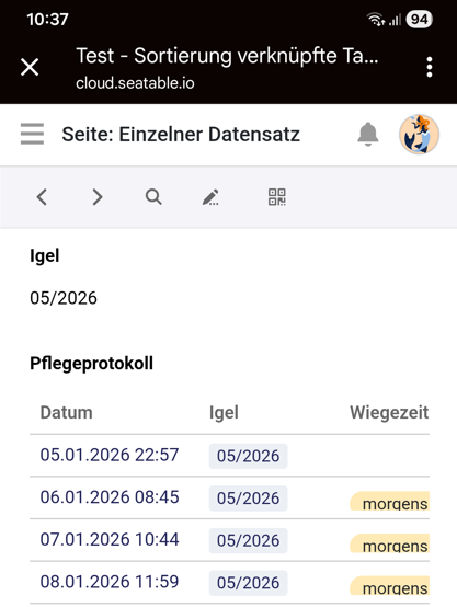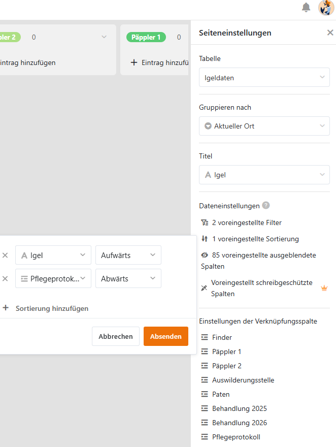 Kurze Erklärung vorab: Wir sind eine gemeinnütziger Verein der hilfsbedürftige Wildtiere (Igel) versorgt. U.a. um die amtlichen Vorgaben zu erfüllen, müssen wir unsere Arbeit dokumentieren. Das haben wir nun versucht über SeaTable umzusetzen.