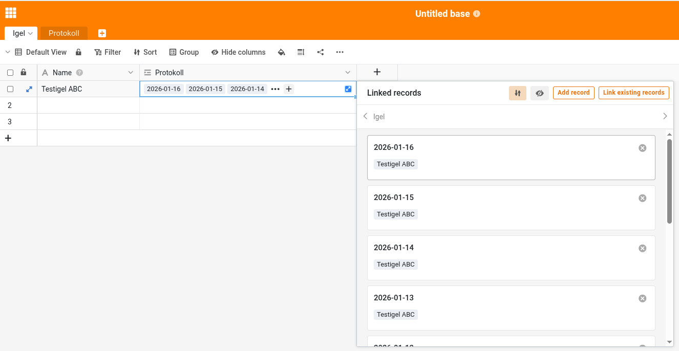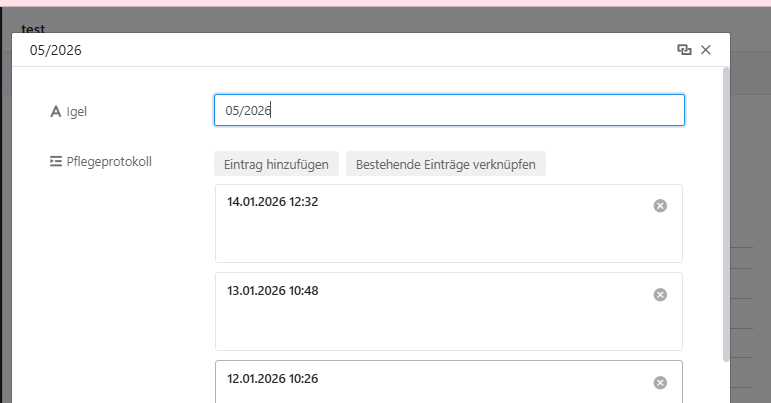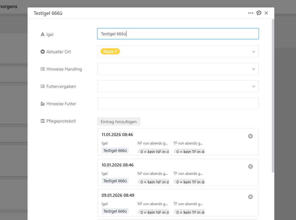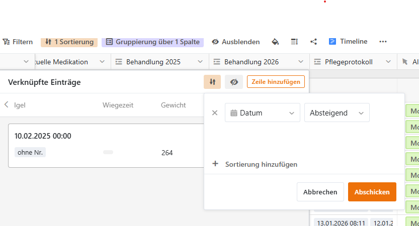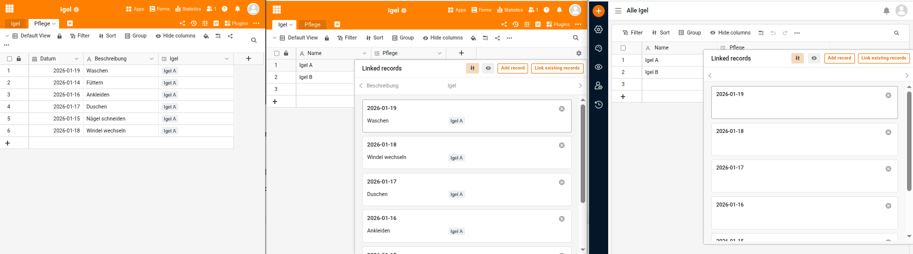 Pflegeprotokoll = Pflege/Futterprotokoll (je Tag eine neue Zeile), Spalten: Datum (erste Spalte), Igel (Verknüpfte Spalte) Gewicht, … etc.