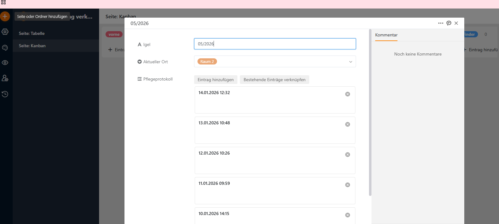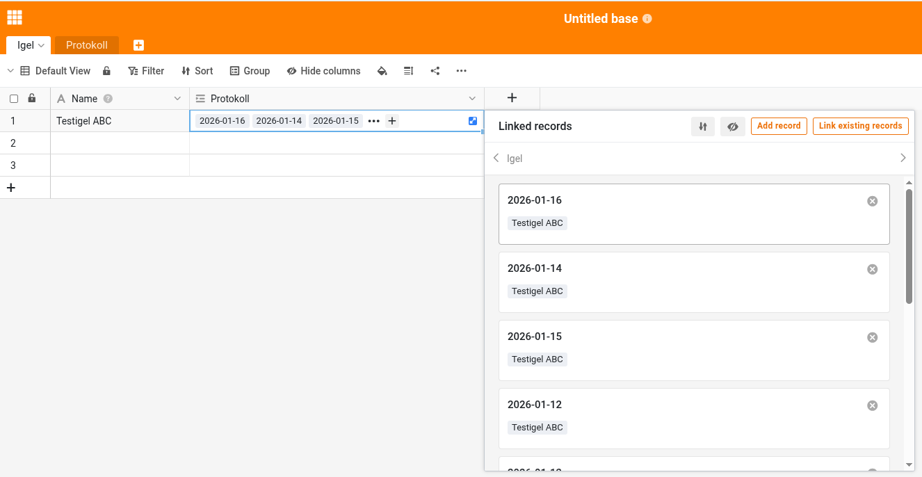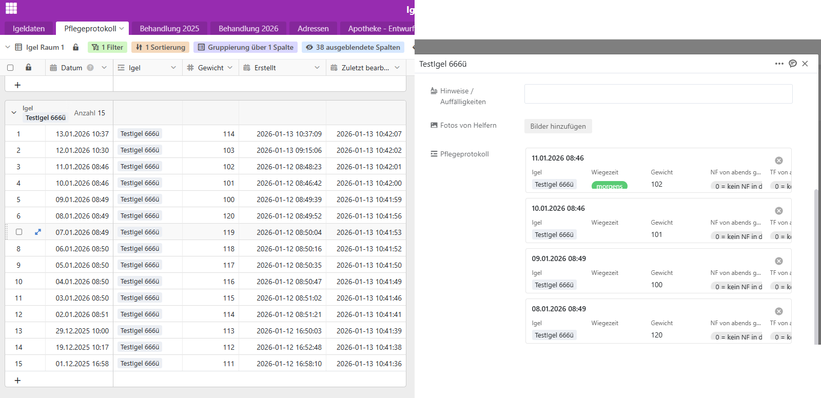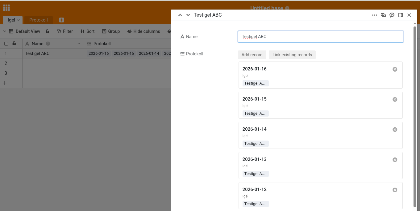 Pflegeprotokoll = Pflege/Futterprotokoll (je Tag eine neue Zeile), Spalten: Datum (erste Spalte), Igel (Verknüpfte Spalte) Gewicht, … etc.