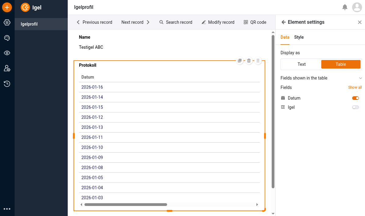 Frage /Problem 3: Universelle App > Einzelner Datensatz, Tabelle: Igeldaten