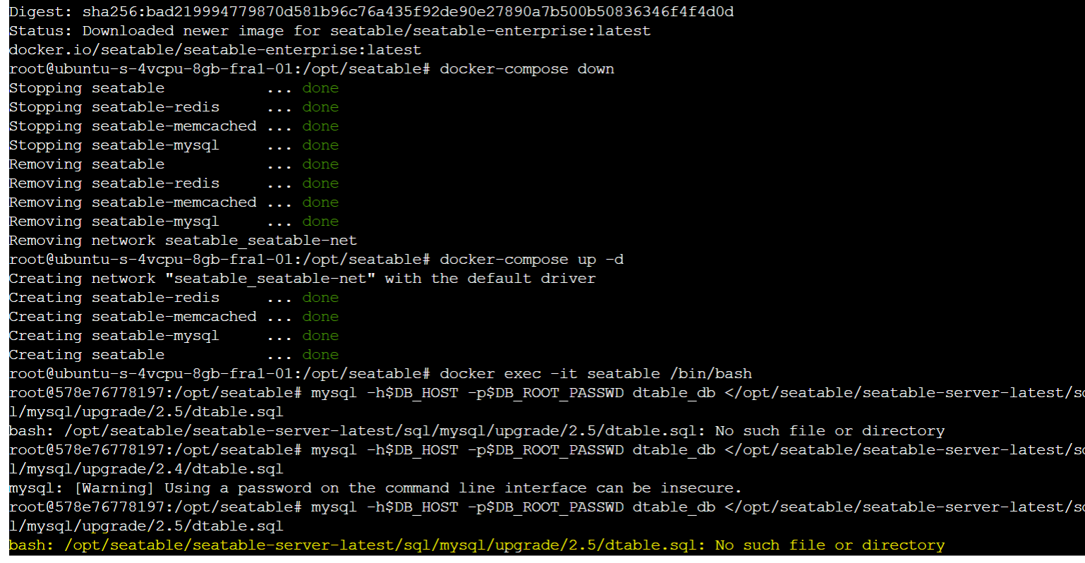 Until now it worked with “seatable/seatable-ee:latest” but now you must type in the right version number in order to pull properly. All the missing mysql folders are now created.