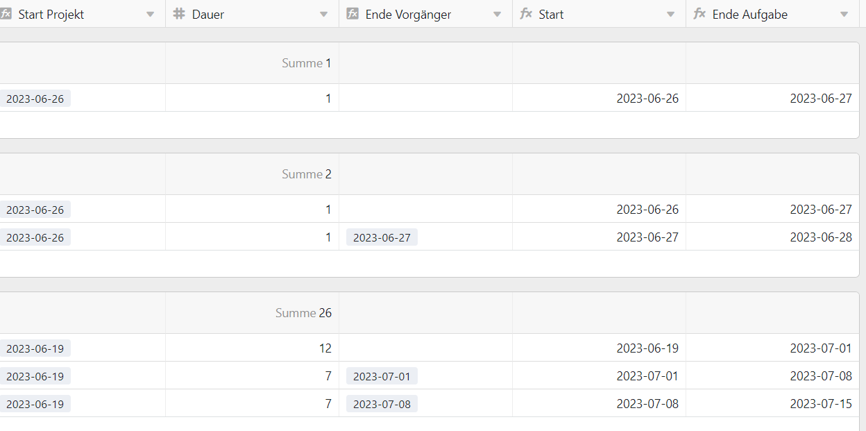 Ende: if(isempty(“Vorgänger”),{Start Projekt}+{Dauer},{Ende Aufgabe})
