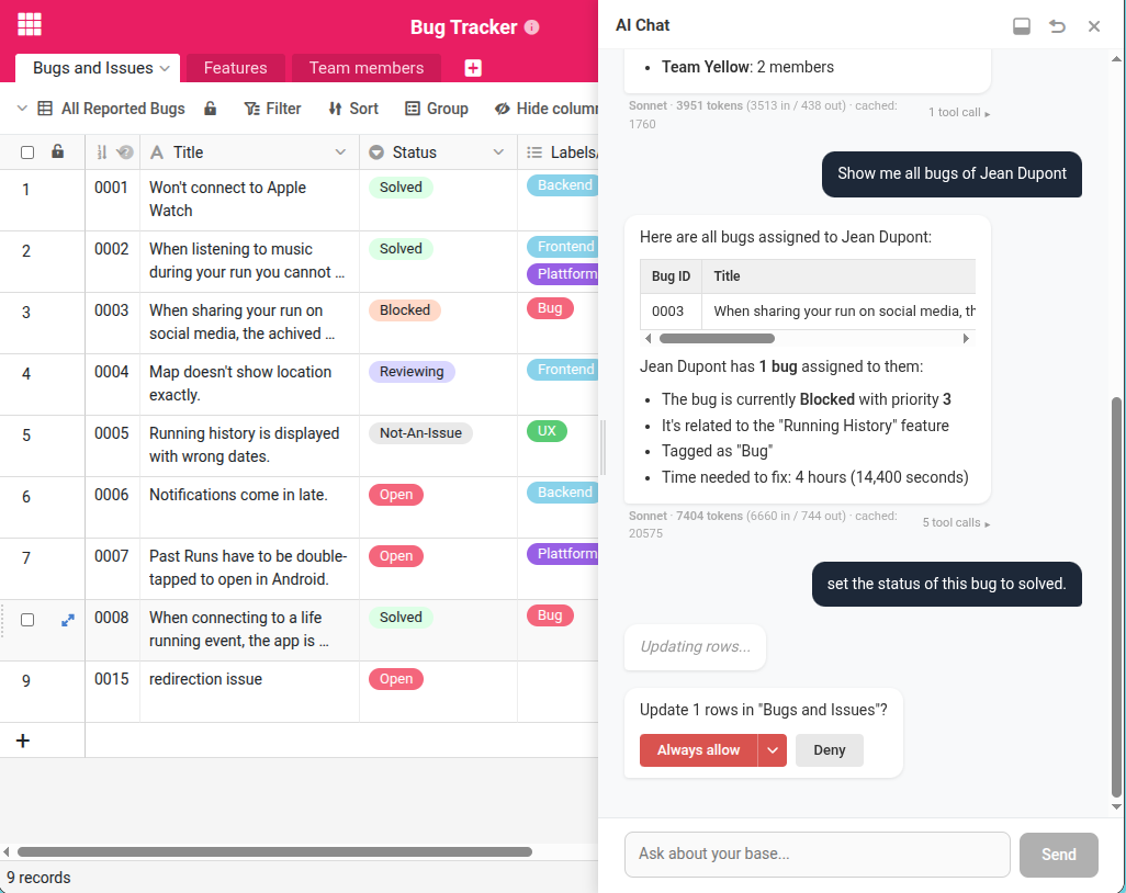 - As a plugin: You open the AI Chat inside a base. You see your tables and data alongside the chat, which gives you full context. The trade-off: you interact with one base at a time.